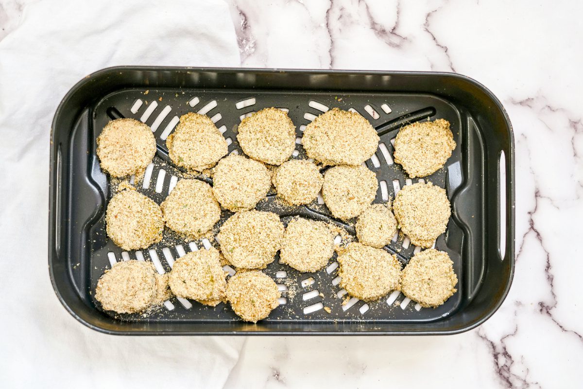 - Arrange breaded pickle chips in air fryer basket in a single layer, not touching. Don’t overcrowd. Work in batches if needed.