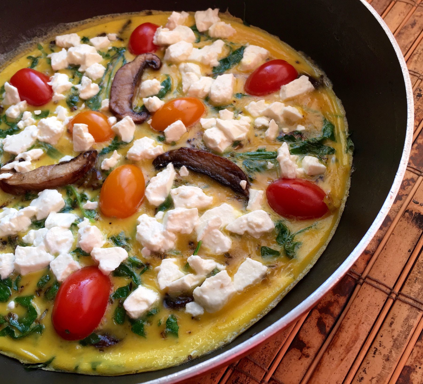 A fluffy stovetop frittata with earthy portobellos, peppery arugula, cherry tomatoes, and creamy feta. No oven required.