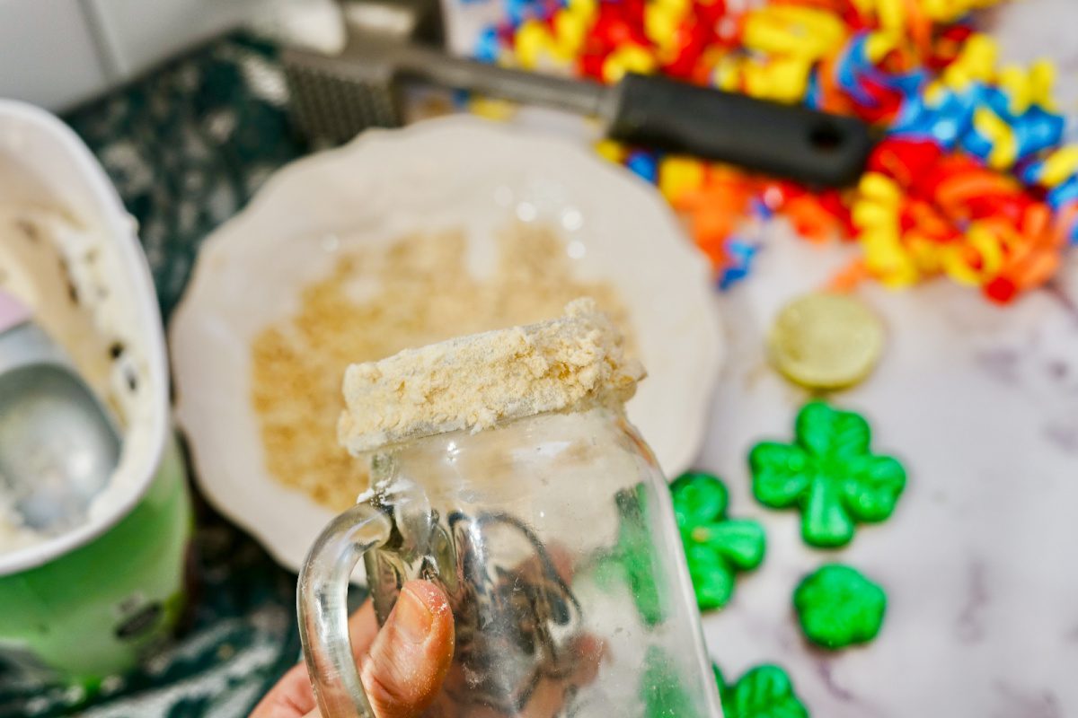 1. Crush a handful of Lucky Charms cereal in a shallow bowl or plate. Coat the rim of your serving glass with vanilla frosting, then roll it in the crushed Lucky Charms to create a festive cereal rim. Set aside.