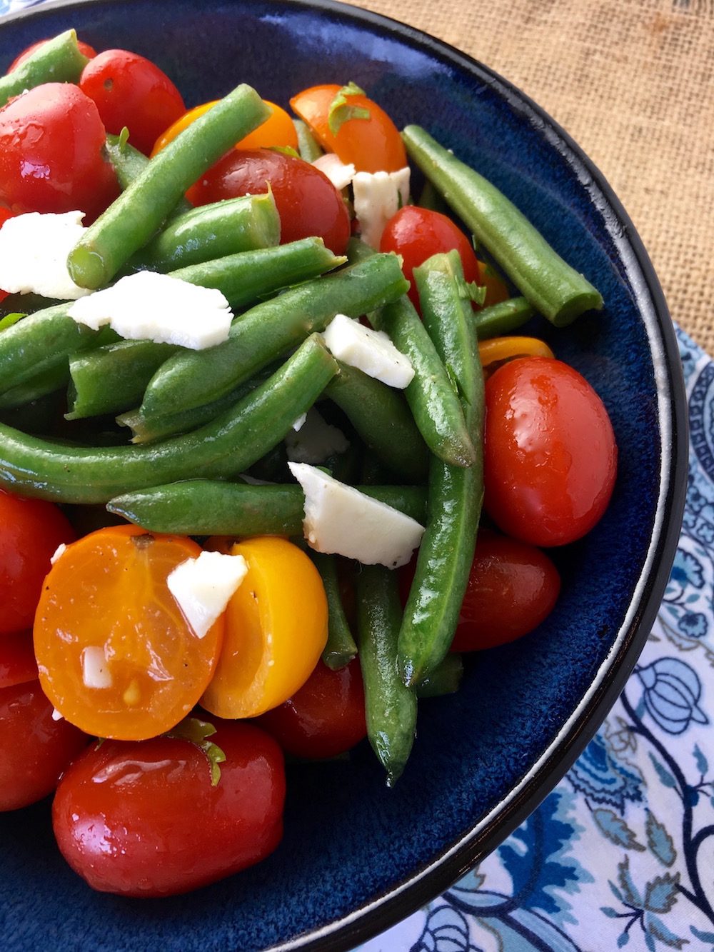 This green bean salad with tomatoes and feta is the fresh spring side dish that works warm or cold. Crisp-tender green beans, juicy tomatoes, fresh herbs, and salty feta in a simple sherry vinegar dressing.