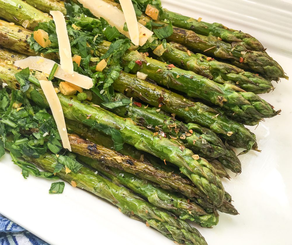 Gremolata sounds fancy but it’s just fresh parsley, lemon zest, garlic, and in this case a little preserved lemon rind for an extra layer of flavor. Three minutes to make, and it transforms simple grilled asparagus into something you’d expect to pay restaurant prices for.