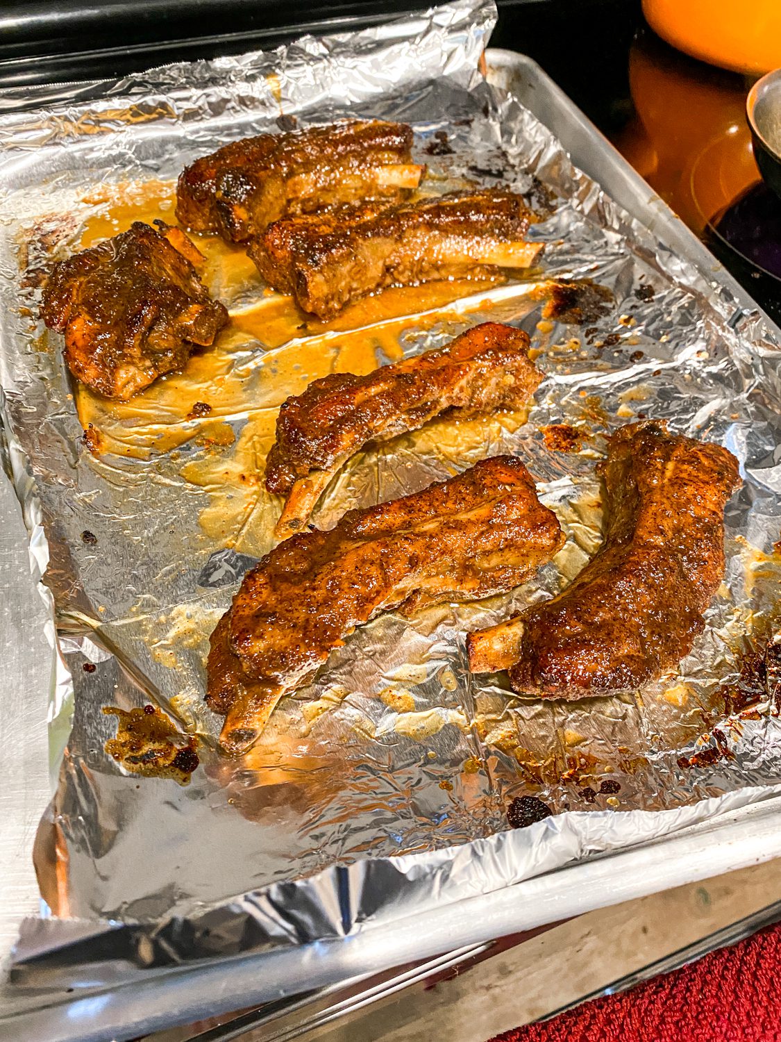 - While ribs cook, line a large rimmed baking sheet with aluminum foil. Set aside.