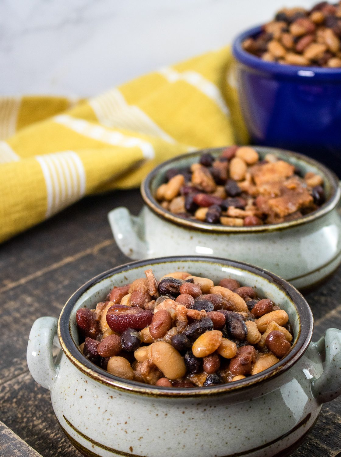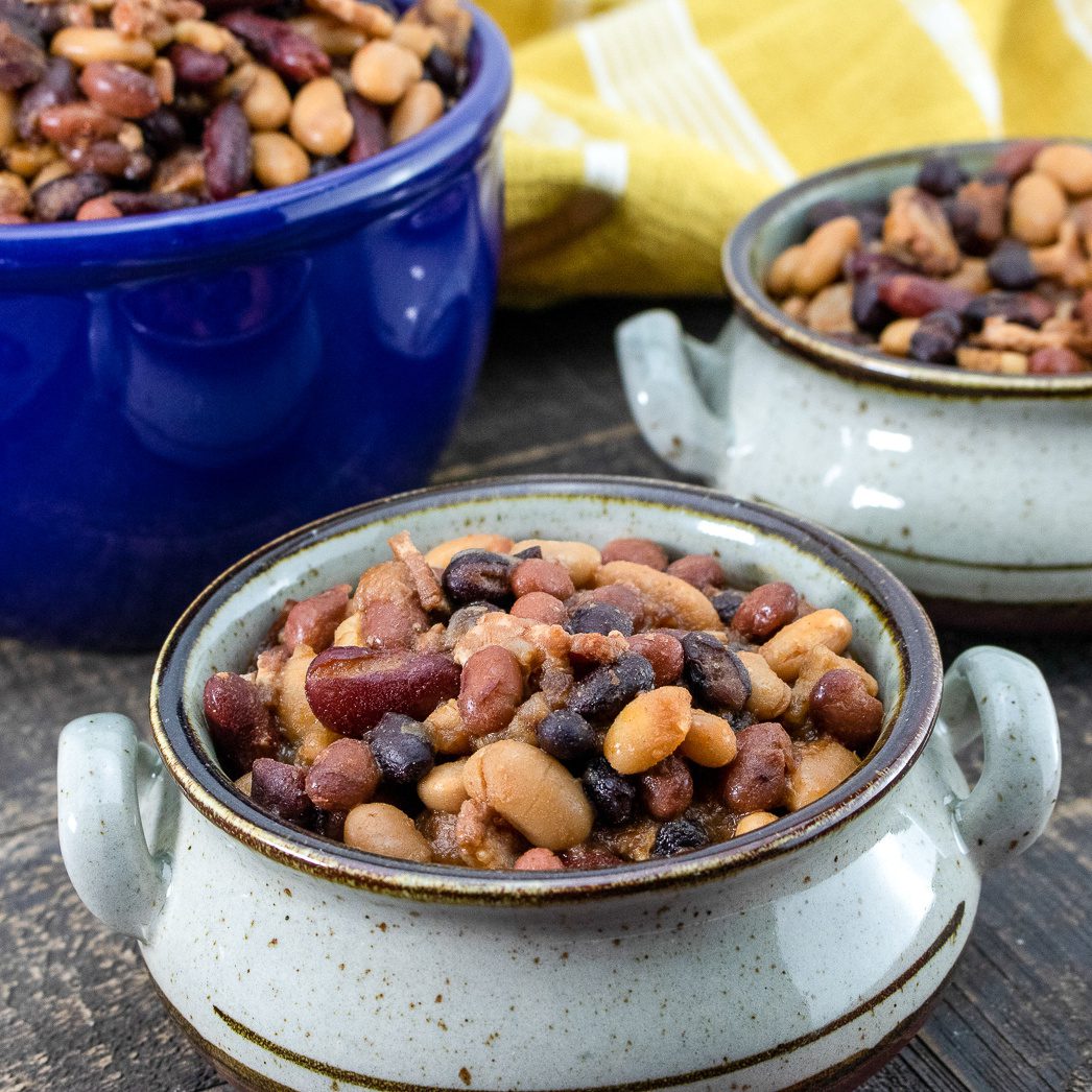 These slow cooker baked beans with bacon are the make-ahead side dish that works for everything from Easter ham to summer BBQs. Five types of beans simmered with crispy bacon, sweet onion, and maple syrup until thick and rich.