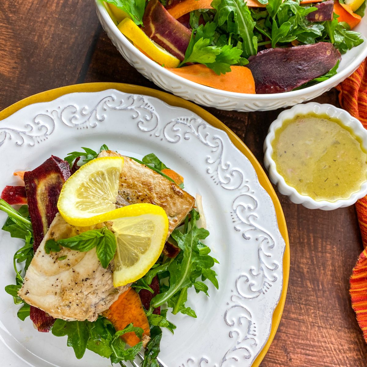 Perfectly golden swordfish with a crispy exterior and tender, flaky center, served over a fresh tangle of carrot ribbons, peppery arugula, and herbs tossed in a bright lemon vinaigrette. It’s the kind of meal that looks impressive but is actually ridiculously easy to pull off.