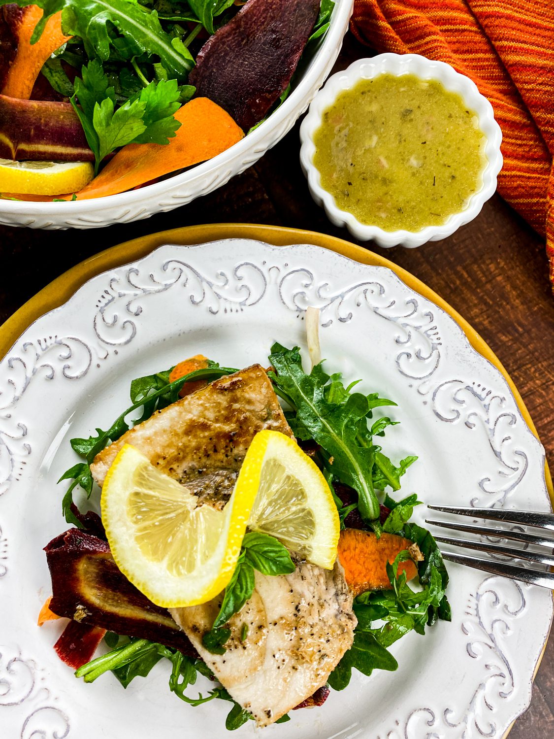 5. Serve: Divide salad among four plates and top each with a swordfish fillet. Garnish with lemon slices and serve with remaining vinaigrette on the side.
