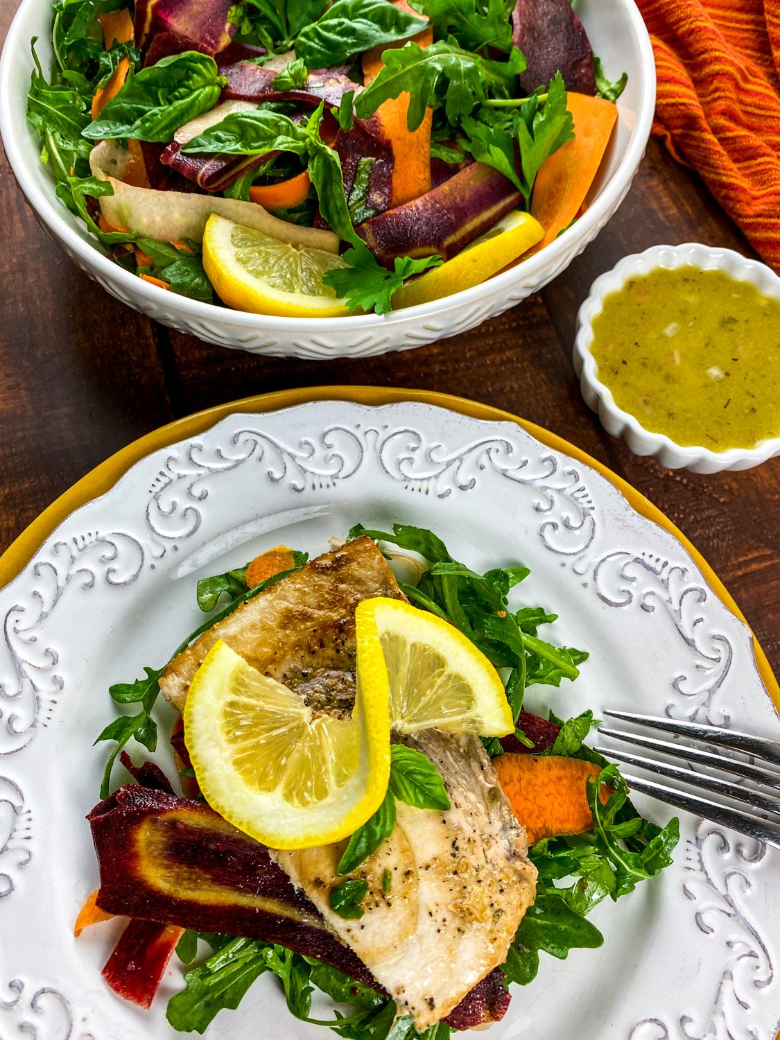 Pan-Seared Swordfish with Rainbow Ribbon Salad