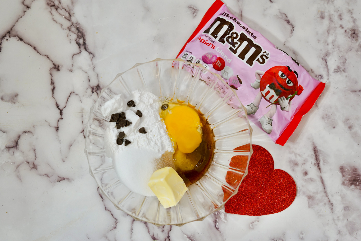 To make these Valentine’s M&M Cookies, you’ll need: