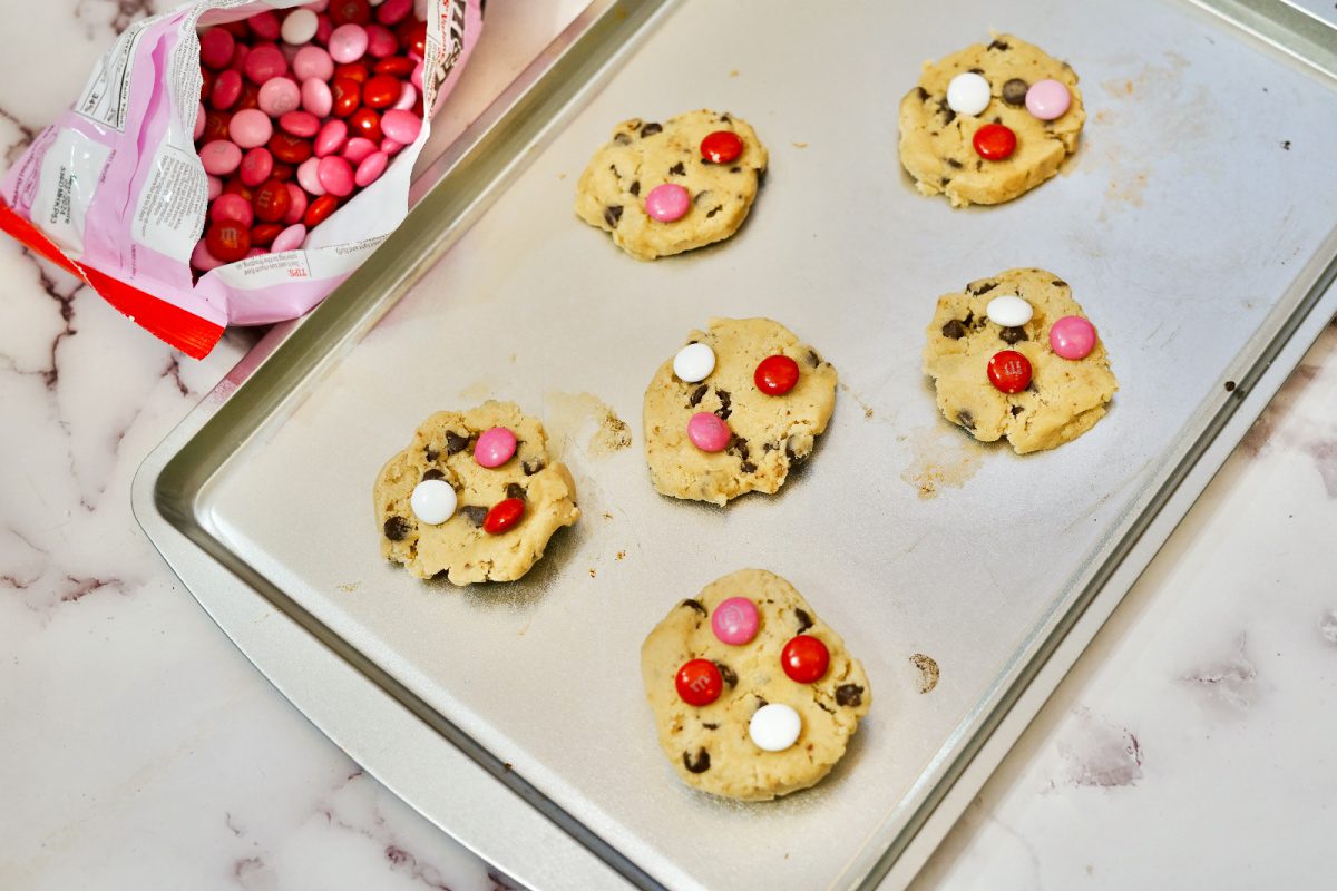 - Scoop the dough and form into 1 ½-inch balls. Place them on your prepared baking sheets, leaving about 2 inches between each cookie. Gently press 4-5 Valentine’s M&Ms into the top of each cookie ball.